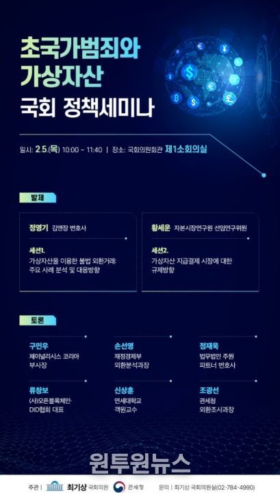 (원투원뉴스) 관세청은 최기상 국회의원(더불어민주당·서울 금천구)과 공동으로 2월 5일 국회 의원회관에서 '초국가범죄와 가상자산: 국경을 넘어선 불법 자금 흐름 대응' 국회 정책 세미나를 개최했다.