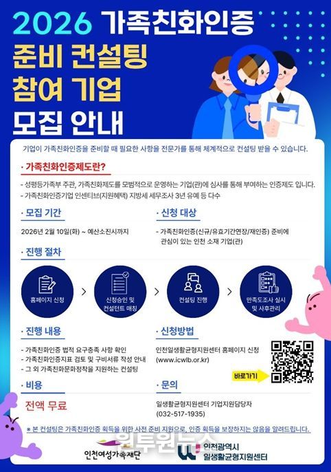 (원투원뉴스) (재)인천여성가족재단 인천일생활균형지원센터가 2026년도 가족친화인증 준비 컨설팅 참여 기업 모집을 시작한다.