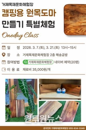 (원투원뉴스) 거제목재문화체험장은 오는 3월 7일과 3월 21일, 성인 방문객을 대상으로 한 원데이클래스 프로그램 『캠핑용 원목도마 만들기 특별체험』을 운영한다고 밝혔다.