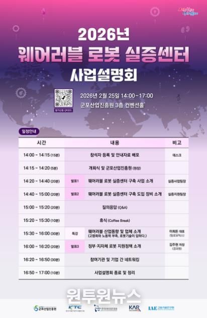 (원투원뉴스) 군포산업진흥원은 오는 2월 25일 오후 2시 진흥원 3층 컨벤션홀에서 ‘웨어러블 로봇 실증센터사업설명회‘를 개최한다고 밝혔다.