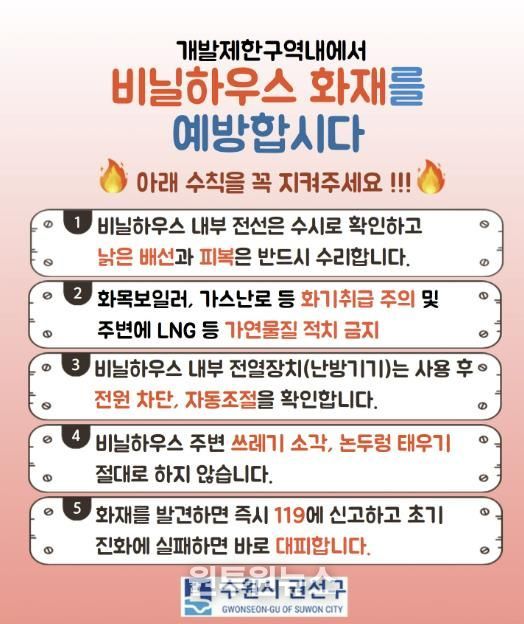 권선구 관계자는 “비닐하우스 화재는 작은 부주의로도 큰 피해로 이어질 수 있는 만큼, 기본적인 안전수칙 실천이 무엇보다 중요하다”며 “앞으로도 개발제한구역 내 화재 취약 시설을 대상으로 지속적인 점검과 홍보 활동을 이어가겠다”라고 밝혔다.