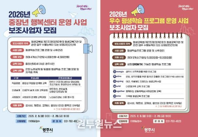 (원투원뉴스) 광주시는 시민의 평생학습 기회 확대를 위해 평생학습 프로그램 수행기관을 공개 모집한다고 6일 밝혔다.