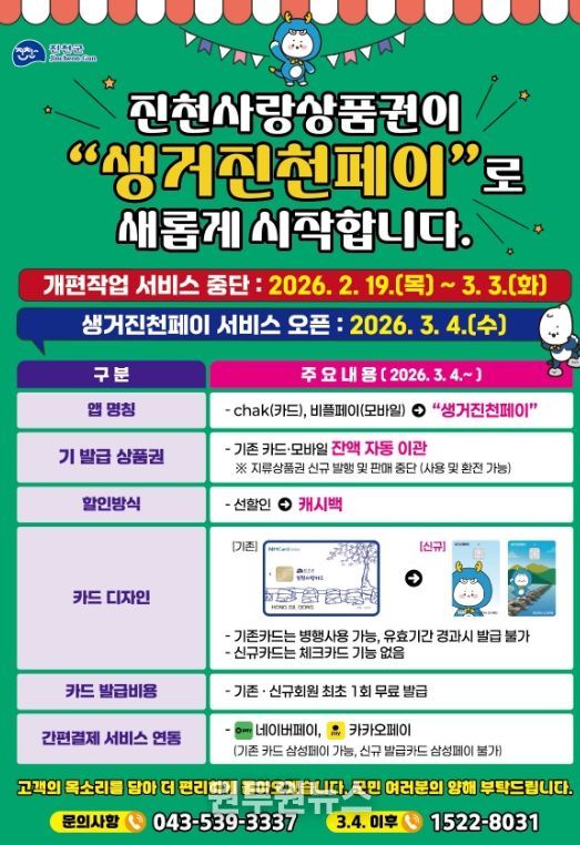 서비스는 오는 3월 4일부터 정상 운영되며, 이용자는 변경된 ‘생거진천페이’ 앱을 내려받아 회원 등록 후 사용할 수 있다.