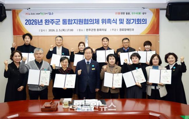 지난 5일 완주군은 군청 중회의실에서 ‘완주군 통합지원협의체’ 위촉식을 열고, 제1차 정기회의를 열어 ‘2026년 통합돌봄사업 실행계획(안)’을 심의·의결했다.