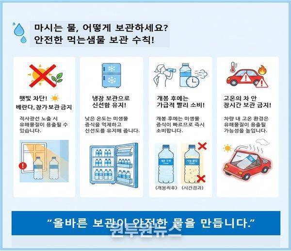 연구원은 먹는샘물은 직사광선을 피하고 서늘한 그늘에 보관해야 하며, 차량 내부에 장시간 방치하지 말고 개봉 후에는 가급적 빠르게 음용하는 것이 바람직하다고 당부했다.