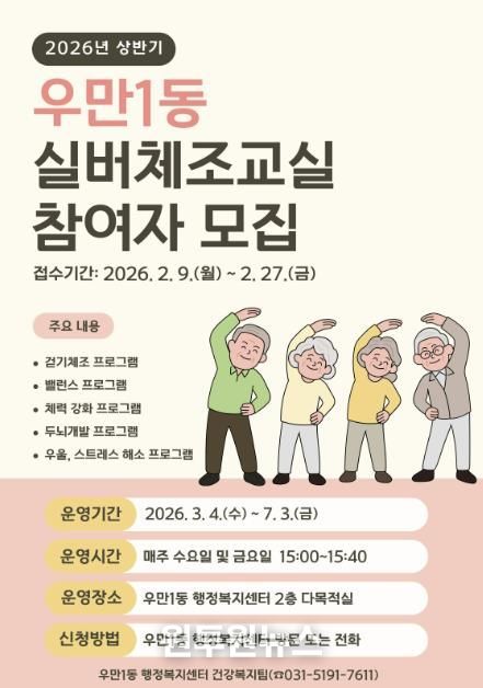 (원투원뉴스) 수원시 팔달구 우만1동은 관내 어르신들의 건강 증진을 위해 2월 9일부터 2월 27일까지 ‘2026년 상반기 실버체조교실’ 참여자를 선착순으로 모집한다고 밝혔다.