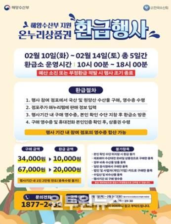 (원투원뉴스) 군산시는 설명절을 앞두고 장바구니 물가 부담을 덜기 위해 농림축산식품부와 해양수산부가 주관하는 ‘2026년 농축·수산물 온누리상품권 환급행사’를 오는 2월 10일부터 14일까지 진행한다고 밝혔다.