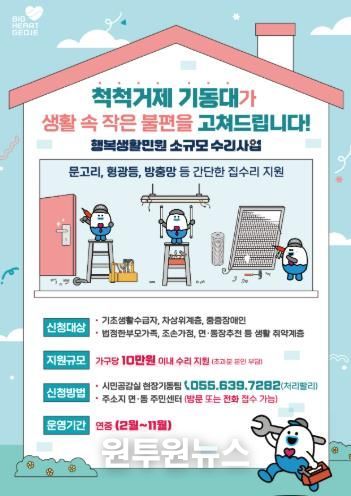 (원투원뉴스) 거제시는 일상생활 속 소소하지만 해결이 어려운 불편을 겪고 있는 취약계층을 지원하기 위해 2026년 '척척거제 기동대 행복생활민원 소규모 수리사업'을 추진한다고 밝혔다.