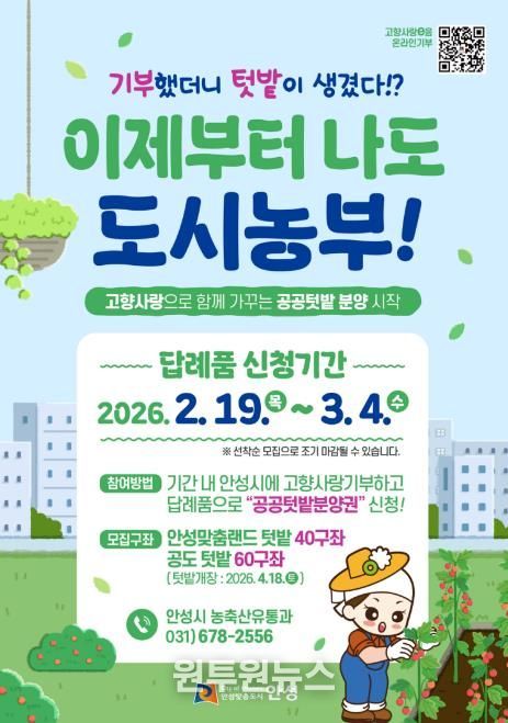 (원투원뉴스) 안성시는 오는 2월 19일부터 고향사랑기부제를 통해 도시농업을 체험하는 ‘도시농부’를 모집한다고 밝혔다.