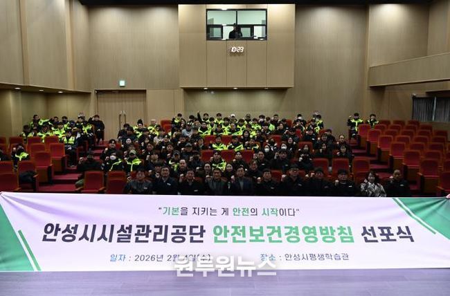 (원투원뉴스) 안성시시설관리공단은 지난 2월 4일, 종사자와 시민의 생명 보호 및 안전한 시설 운영을 위한 ‘2026년 안전보건경영방침 선포식’을 개최했다고 밝혔다.