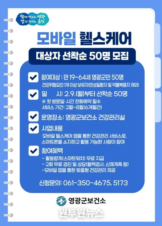 (원투원뉴스) 영광군보건소는 오는 2월 9일부터 모바일헬스케어 사업 1기 참여자 50명을 선착순 모집한다고 밝혔다.