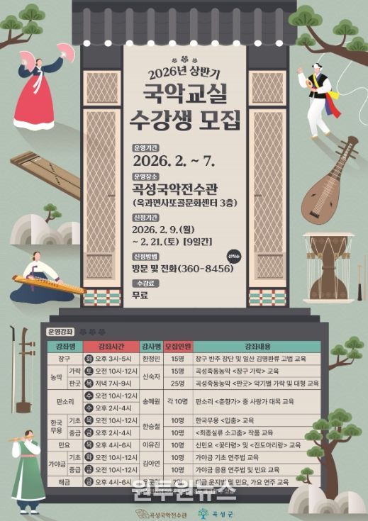 (원투원뉴스) 전남 곡성군은 곡성국악전수관에서 운영하는‘2026년 상반기 국악교실’수강생을 모집한다고 6일 밝혔다.