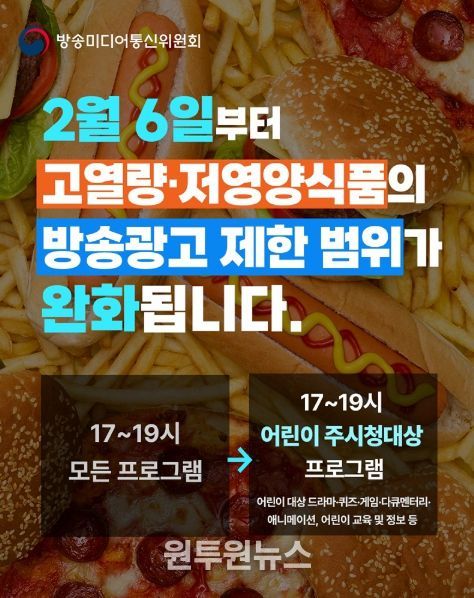 (원투원뉴스) ■ 2월 6일부터 고열량·저영양식품의 방송광고 제한 범위가 완화됩니다.
