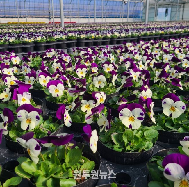 농업기술센터는 지난겨울 동안 심천면 약목리 꽃묘장 3,000㎡ 비닐하우스에서 팬지, 비올라, 버베나 퀄츠, 꽃잔디 등 16만 본의 꽃묘를 생산하고 있다.