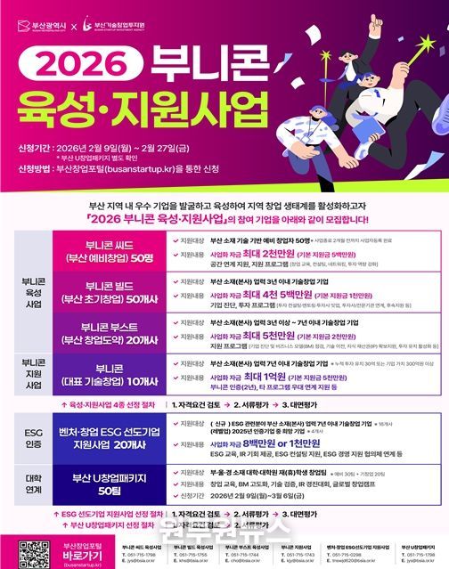 (원투원뉴스) 부산시와 부산기술창업투자원은 지역 내 우수 기술 창업 기업을 발굴하고 부산형 유니콘 기업인 '부니콘(Bunicorn)'으로 육성하기 위해 '2026 부니콘 육성·지원사업' 참여 기업을 통합 모집한다고 밝혔다.
