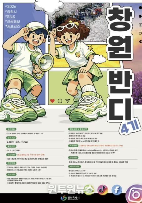 (원투원뉴스) 창원특례시는 창원 관광의 매력을 알릴 참신한 온라인 콘텐츠를 발굴하고 시민과 소통하는 관광홍보를 강화하기 위해 '2026 창원시 SNS 관광홍보 서포터즈 ‘창원반디 4기’'를 모집한다고 밝혔다.