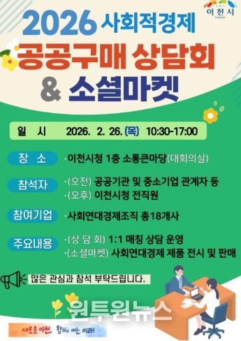 (원투원뉴스) 이천시는 오는 2월 26일 오전 10시 30분부터 오후 5시까지, 이천시청 1층 소통큰마당에서 사회적경제 공공구매 활성화를 위한 ‘사회적경제 공공구매 상담회&소셜마켓’ 행사를 운영한다고 밝혔다.