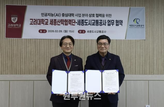 (원투원뉴스) 세종도시교통공사는 2월 9일, 공사 사장실에서 고려대학교 세종산학협력단과 ‘인공지능(AI) 중심대학 사업 협력 및 공사 사업 AX(AI 전환) 가속화를 위한 업무협약(MOU)’을 체결했다고 밝혔다.