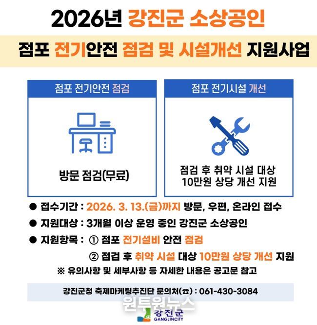 (원투원뉴스) 강진군이 소상공인 사업장의 전기시설을 점검하고 개선하여 화재 등 재난 예방을 위해 안정적인 점포 환경을 조성할 수 있도록 지원사업을 모집한다.