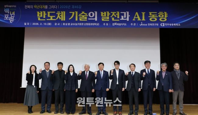 (원투원뉴스) 전북연구원(원장 최백렬)은 10일 오전 8시, 전북특별자치도청 4층 대회의실에서 싱가포르 난양공과대학교 채상훈 교수를 초청해 ‘반도체 기술의 발전과 AI 동향’을 주제로 '전북 백년포럼'을 개최했다. 채 교수는 반도체 전문가로, 2026년 1월 ‘자랑스런 전북인상'을 수상했다.
