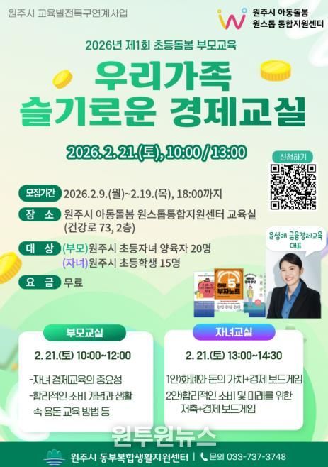 (원투원뉴스) 원주시 아동돌봄 원스톱통합지원센터는 2월 21일 초등생 가족을 위한 무료 경제 교육인'우리 가족 슬기로운 경제 교실'을 운영한다.
