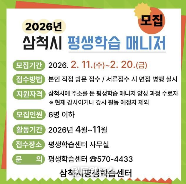 (원투원뉴스) 삼척시는 2월 11일부터 20일까지 평생학습 매니저 양성과정 수료자를 대상으로 2026년 삼척시 평생학습 매니저를 모집한다고 밝혔다.
