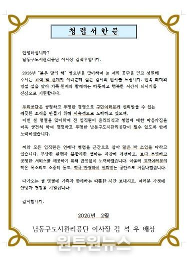 (원투원뉴스) 인천시 남동구 도시관리공단은 청렴 문화 정착을 위해 공사, 용역, 물품 관련 업체와 전 직원에게 ‘청렴 서한문’을 발송했다고 11일 전했다.