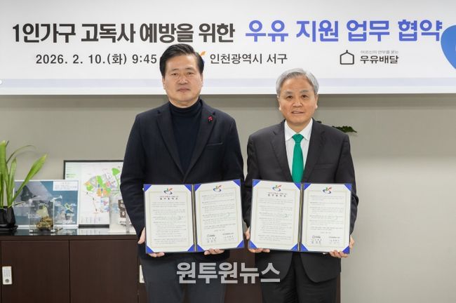 (원투원뉴스) 인천 서구는 지난 10일 (사)어르신의안부를묻는우유배달(이사장 호용한)과 함께 독거노인 가구 고독사 예방과 지역사회 복지 안전망 강화를 위한 업무협약(MOU)을 체결했다.