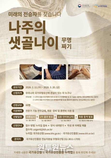 (원투원뉴스) 국가유산청은 국가유산청 산하 국가유산진흥원과 2월 11일부터 3월 20일까지 단절 위기의 국가긴급보호무형유산인 '나주의 샛골나이(무명짜기)'의 미래 전승자 발굴을 위한 공모를 진행한다.