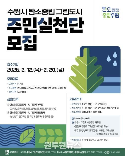 (원투원뉴스) 수원특례시가 ‘생활 속 탄소중립 실천’을 확산하기 위해 2월 12일부터 20일까지 탄소중립 그린도시 사업 대상지 주민·생활권자를 대상으로 ‘수원시 탄소중립 그린도시 주민실천단’ 신규 참여자를 모집한다.