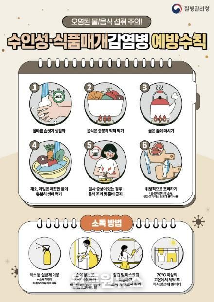 또한 연휴 기간 음식 관리가 소홀해질 경우 수인성·식품매개감염병이 발생할 수 있다. 특히 겨울철에 많이 발생하는 노로바이러스 감염증 환자가 높은 수준을 보이고 있어 각별한 주의가 필요하다. 노로바이러스는 사람 간 전파가 가능하므로 귀가 후와 식사 전에는 30초 이상 비누로 손을 씻고, 음식은 흐르는 물에 세척한 뒤 85℃ 이상에서 1분 이상 충분히 익혀 먹어야 한다. 해외여행 시에도 오염된 식수와 음식 섭취로 세균성 이질, 콜레라 등에 감염될 수 있어 주의해야 한다.