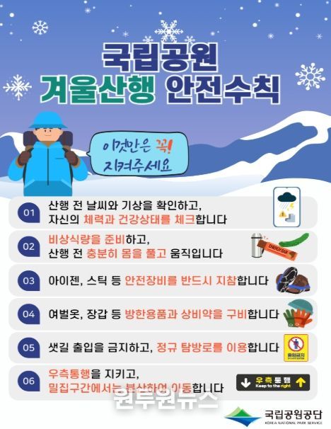 (원투원뉴스) 기후에너지환경부 산하 국립공원공단(이사장 주대영)은 2월 14일부터 18일까지 설 연휴 탐방객 안전관리 대책 기간으로 지정하고, 국립공원 주요 지역 1,544곳에 인력 4,833명을 집중 배치해 탐방객의 생명과 안전을 지키기 위한 현장 대응을 대폭 강화한다고 밝혔다.