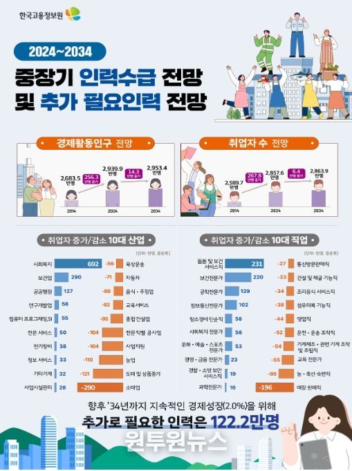 (원투원뉴스) 한국고용정보원(원장 이창수)은 '중장기 인력수급 전망'을 통해 향후 10년간 우리나라 노동시장의 인력공급(경제활동인구)과 인력수요(취업자)가 구조적으로 전환되는 양상을 전망하고, 향후 지속적인 성장을 위해 추가로 필요한 인력을 추계했다.