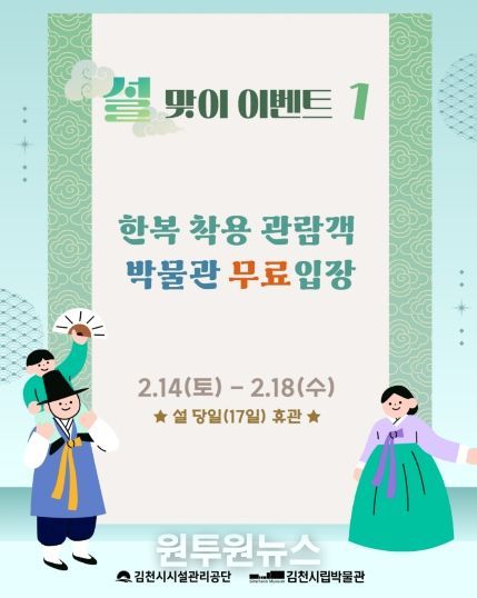 (원투원뉴스) 김천시시설관리공단(이사장 김재광)은 2026년 설 명절을 맞아 감문국이야기나라와 김천시립박물관을 중심으로 가족 단위 관람객이 함께 즐길 수 있는 ‘설맞이 문화 행사’를 운영한다. 이번 행사는 2월 14일부터 2월 18일까지 진행된다.