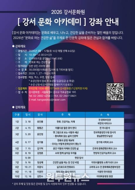 (원투원뉴스) 서울 강서구 강서문화원(원장 김진호)은 오는 3월부터 12월까지 주민들의 인문학적 역량을 키우고 건강한 삶을 위한 ‘2026 강서 문화 아카데미’를 개최한다고 밝혔다.