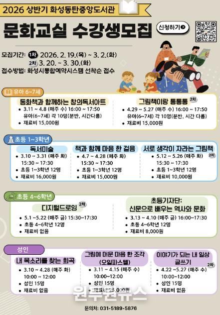 (원투원뉴스) 화성특례시는 지난해 11월 3일 개관한 화성동탄중앙도서관에서 시민들이 다양한 독서·문화 활동을 즐길 수 있도록 2026년 상반기 문화교실 프로그램을 운영한다고 밝혔다.