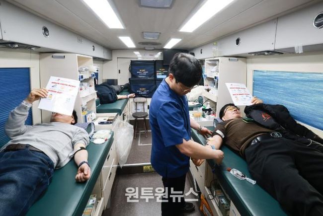 (원투원뉴스) 대전 유성구는 13일 유성구청 주차장에서 ‘혈액 수급 안정화를 위한 단체 헌혈 행사’를 진행했다.