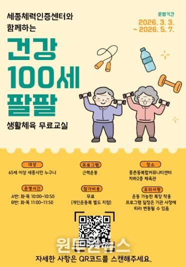 (원투원뉴스) 세종특별자치시체육회는 세종특별자치시 및 세종체력인증센터와 함께 65세 이상 시민을 대상으로 진행하는 「건강 100세 팔팔 생활체육 무료교실」 참가자를 모집한다.