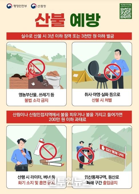 ▴설 연휴 성묘 등으로 입산시 라이터 등 인화물질 소지 금지, 취사 또는 흡연 등 불씨를 만들 수 있는 행동 삼가 ▴산림과 가까운 곳에서 영농부산물·쓰레기 등 소각 금지 ▴연기나 불씨 발견 시 즉시 119 또는 112신고