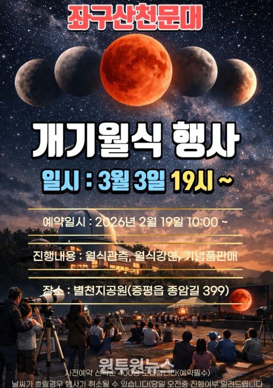 (원투원뉴스) 충북 증평군 좌구산천문대가 2년 만에 찾아오는 개기월식을 맞아 내달 3일 현장 관람과 야외 공개관측, 유튜브 생중계를 동시 운영한다.