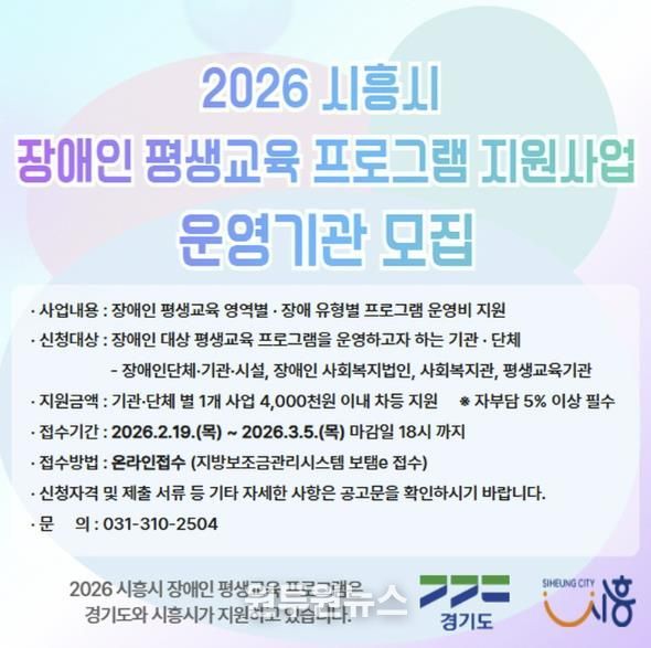 (원투원뉴스) 시흥시는 장애인의 학습권을 보장하고 사회참여 기회를 확대하기 위해 ‘2026년 장애인 평생교육 프로그램 지원사업’을 추진하는 가운데 운영기관을 모집한다.