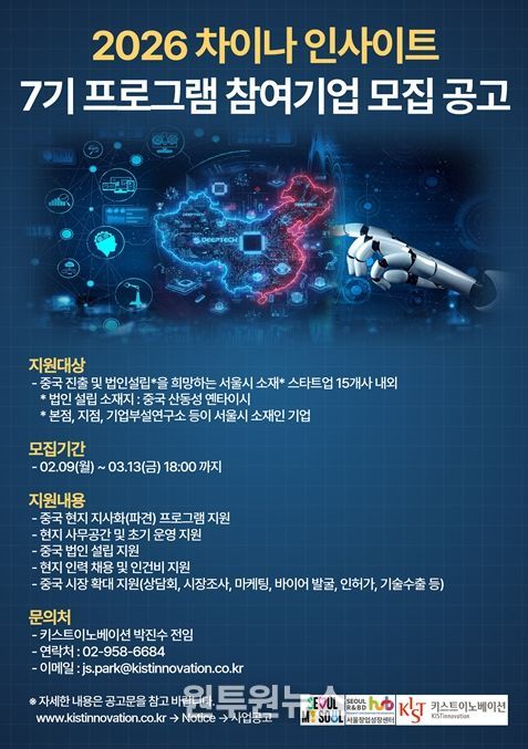 중국 프로그램은 “2026 차이나 인사이트 7기 프로그램”으로 스타트업플러스 플랫폼에 2월 9일부터 3월 13일까지 공고 및 접수 후 서류 및 발표평가를 통해 서울시 창업기업 15개사를 선정하여 4월부터 12월까지 관련 프로그램을 지원할 예정이다.
