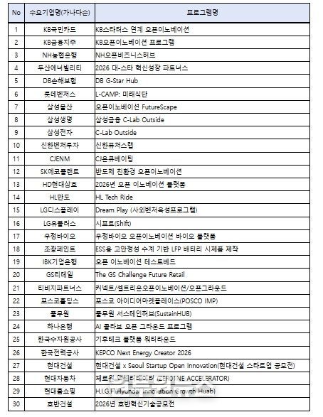 한편, 중기부는 금번 ‘전략과제 해결형’ 외에도, ‘민간 선별·추천형’에서 오픈이노베이션 지원 프로그램 30개를 선정했다. 현대자동차 (제로원), 삼성전자 (C-Lab Outside) 등 오픈이노베이션 역량·실적이 우수한 대기업들이 새롭게 참여했으며, 기업 자체적 오픈이노베이션 프로그램을 통해 선별된 스타트업을 프로그램 운영기업에서 추천시 중기부에서 연계 지원할 예정이다.
