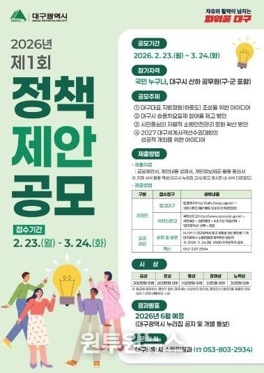 (원투원뉴스) 대구광역시는 전 국민과 시 산하 공무원의 창의적인 정책 아이디어를 발굴해 시정 발전의 동력으로 활용하고자 ‘2026년 제1회 정책제안 공모’를 개최한다.