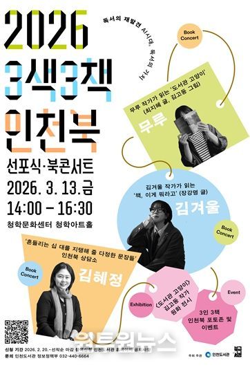 (원투원뉴스) 인천광역시 인천도서관은 ‘2026년 3색3책 인천북 선포식·북콘서트’를 오는 3월 13일 오후 2시 청학문화센터 청학아트홀에서 개최한다고 밝혔다.