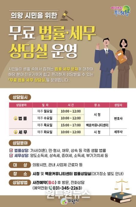 (원투원뉴스) 의왕시가 시민들의 생활 속 법률·세무 고민 해결을 위한 ‘무료 법률‧세무 상담실’을 연중 운영하고 있다.
