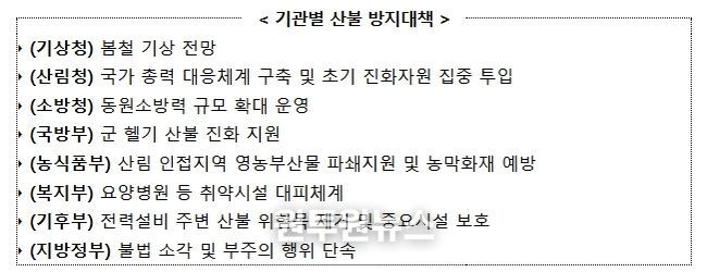 이번 회의는 지난해보다 산불 발생 건수와 피해면적이 크게 증가하고 당분간 건조한 날씨가 지속될 것으로 전망됨에 따라, 산불 예방 및 대응 태세를 점검하기 위해 마련됐다.