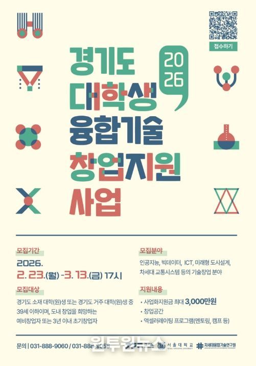 (원투원뉴스) 경기도와 차세대융합기술연구원은 ‘2026년 경기도 대학(원)생 융합기술 창업지원’ 사업 참가자를 다음 달 13일까지 모집한다.