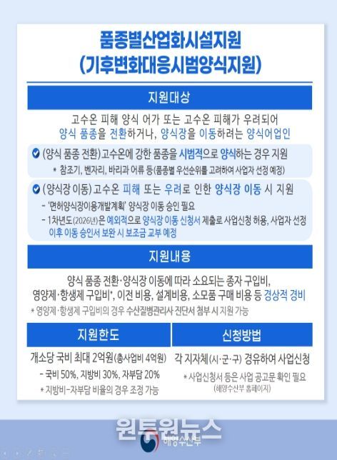 (원투원뉴스) 해양수산부는 기후변화에 선제적으로 대응하고 어가의 소득 안정을 도모하기 위해 2월 23일부터 3월 31일까지 ‘2026년 기후변화 대응 시범 양식 지원사업’ 대상 어가를 공모한다고 밝혔다.