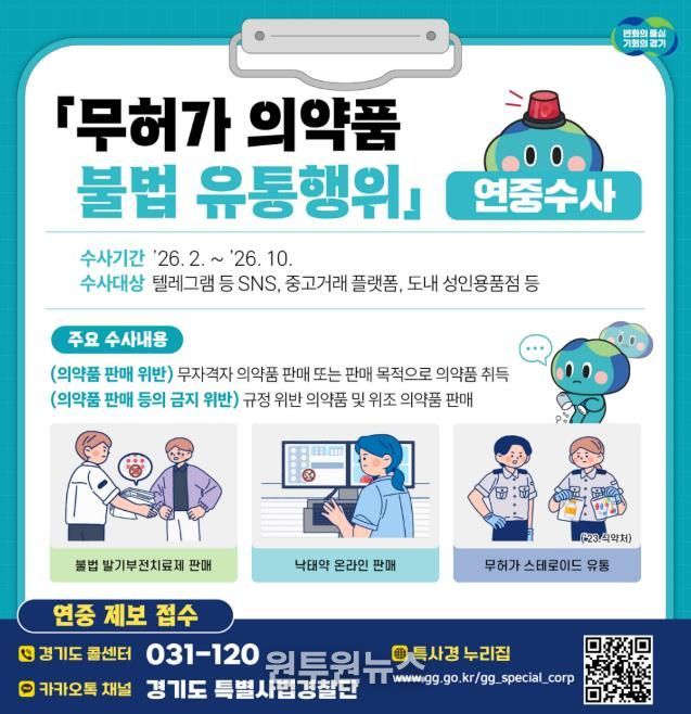 (원투원뉴스) 경기도 특별사법경찰단(특사경)이 비대면 유통망 확산을 틈타 급증하고 있는 무허가 전문의약품 불법 유통 근절을 위한 집중 수사에 나선다.